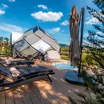 The 1-bedroom Kosmaj Zomes Villa Rovace, located within 6 km of Tresije, invites guests to relax in a Jacuzzi.